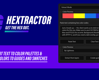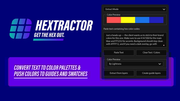 Instantly extract hex color codes from text, layers, or images and generate color controls and color swatches in dedicated comps. Hextractor also allows you to save/load palettes so you can switch projects easily.